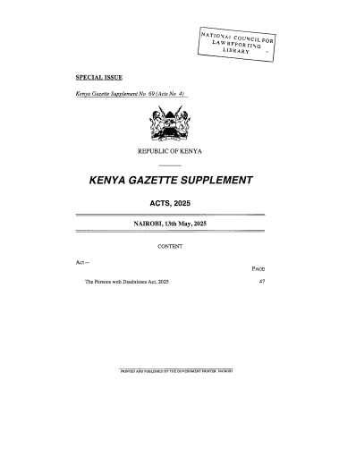 The Persons with Disabilities Act 2025 updates Kenya’s laws to strengthen inclusion and equality for people with disabilities. It replaces the 2003 law and sets clear responsibilities for both national and county governments to ensure access to education, employment, health care, justice, and public participation. The Act prohibits discrimination, abuse, and harmful practices and guarantees accessibility in transport, buildings, technology, and financial services. It also encourages inclusion by offering incentives for employers who hire and support people with disabilities.